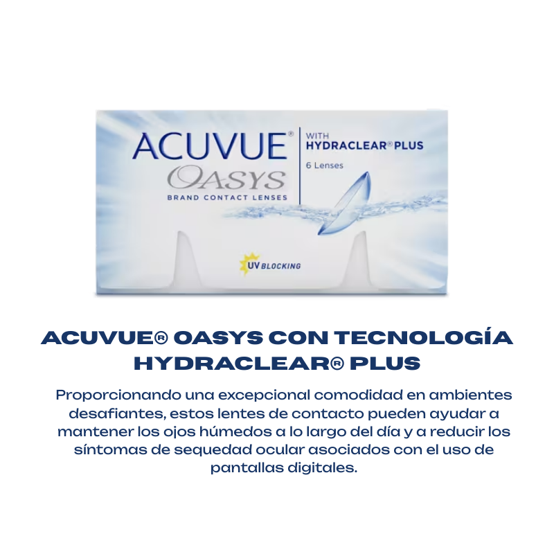 ¿Cansado de los lentes de contacto que se secan y te incomodan los ojos? los Lentes de contacto Acuvue Oasys Promo 2 cajas están diseñado para brindar una comodidad excepcional, incluso en entornos difíciles. Ya sea que pases horas frente a la pantalla del ordenador, luchando contra el aire acondicionado seco o disfrutando de un día al aire libre, estos lentes mantendrán tus ojos frescos e hidratados.