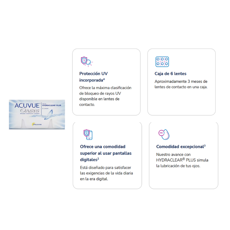 La salud de sus ojos es fundamental. Los lentes de contacto Acuvue Oasys con HydraClear Plus ofrecen protección UV de clase 1, bloqueando más del 99 % de los rayos UVB y el 96 % de los rayos UVA, lo que ayuda a proteger sus ojos de los efectos nocivos del sol. Recuerde que los lentes de contacto con absorción de rayos UV NO sustituyen a las gafas protectoras con absorción de rayos UV, como las gafas o gafas de sol con absorción de rayos UV, ya que no cubren completamente el ojo ni la zona circundante. Debe seguir usando gafas con absorción de rayos UV según las indicaciones de su profesional de la visión.
